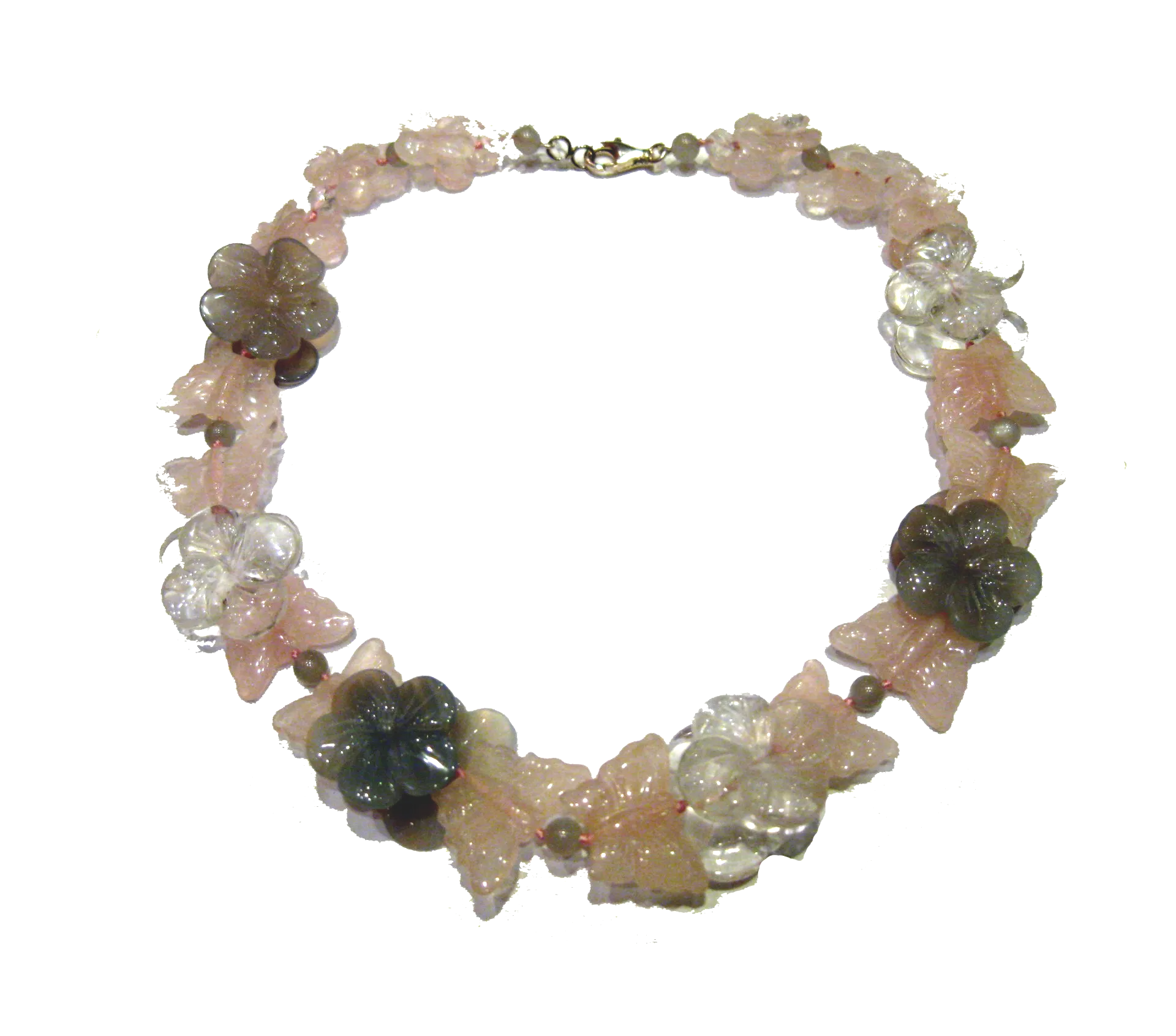 Collier en quartz rose, quartz fumé, quartz incolore gravés en forme de papillons, fleurs et boules