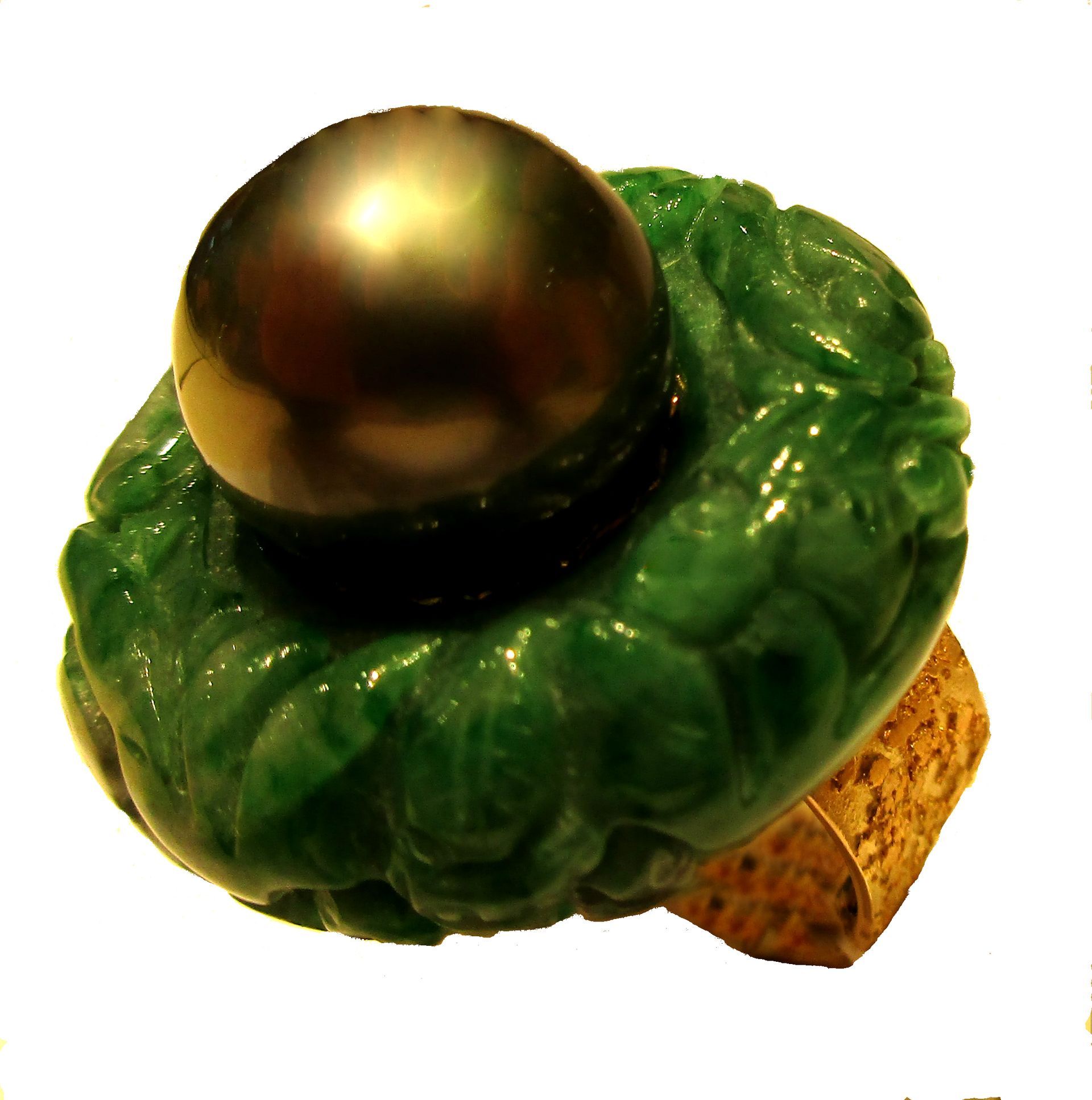 Contraste entre l'or amati et la douceur du cabochon en jade vert, cette dualité entre les matières forment au contraire une complémentarité , la forme de cette bague est libre et fluide sur le doigt apportant un confort une fois portée