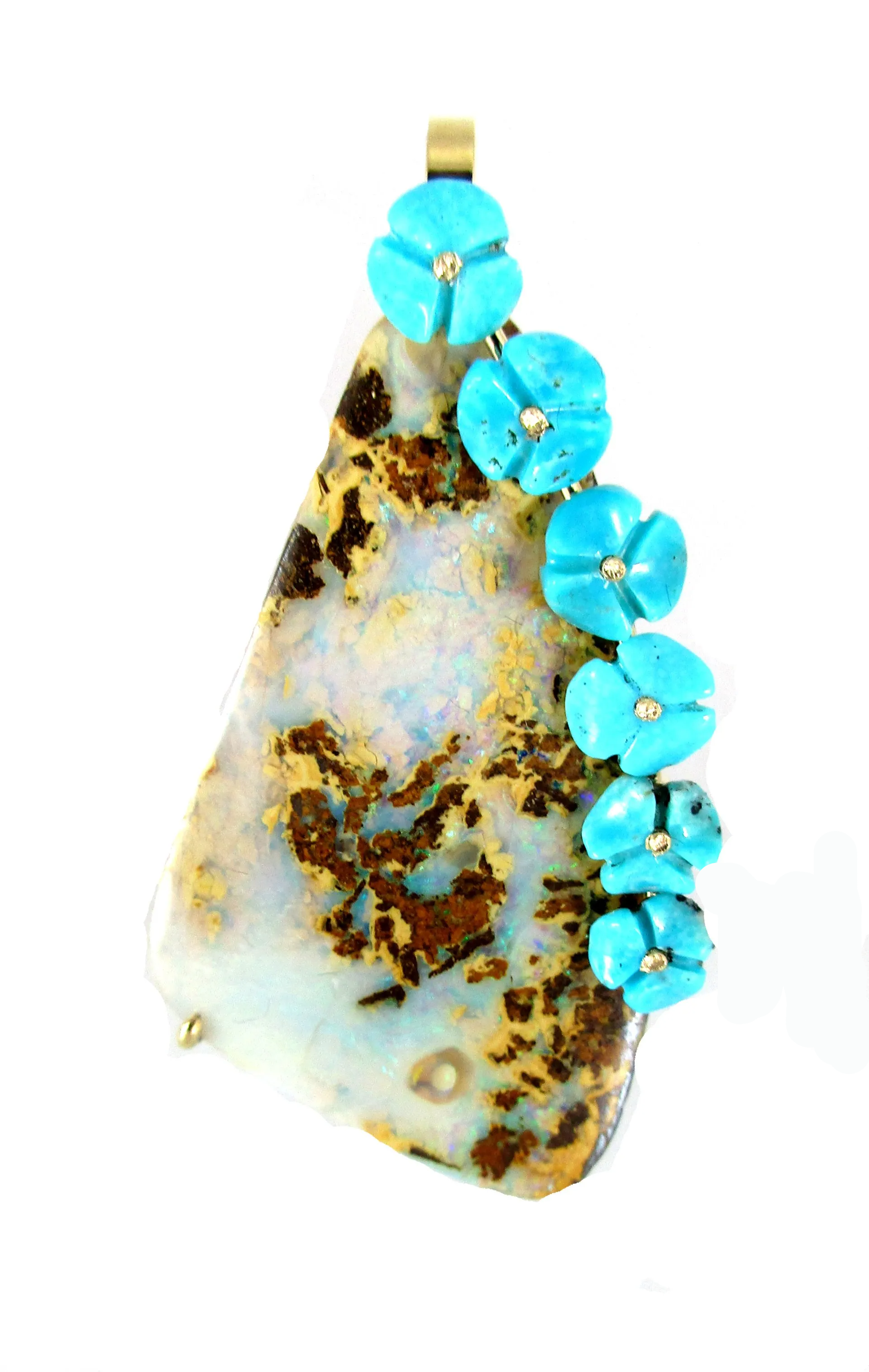 Pendentif or jaune 750/1000 composé d'une opale matrix et petites turquoises taillées en fleur
